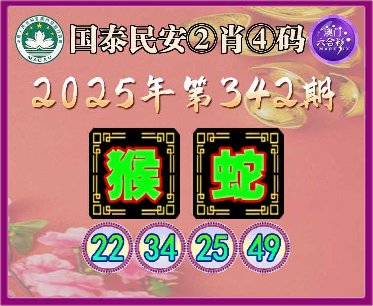 342期:【国泰民安】 🥩②肖④码🥩【猴蛇】【22.34.25.49】开:虎04错